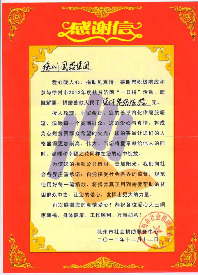 為認(rèn)真貫徹市委辦公室、市政府辦公室《關(guān)于開(kāi)展扶貧濟(jì)困“一日捐”活動(dòng)的通知》(徐委辦﹝2012﹞105號(hào))精神,集團(tuán)公司于11月上旬組織開(kāi)展了扶貧濟(jì)困“一日捐”工作。截至目前,集團(tuán)公司本部及所屬企業(yè)共捐款17700元。其中:集團(tuán)公司本部捐款7350元,國(guó)泰公司捐款2650元,華強(qiáng)公司捐款520元,華安公司捐款1200元,金龍成功物業(yè)公司捐款750元,科創(chuàng)軟件園公司捐款780元,彭富公司捐款1430元,海鷗集團(tuán)捐款3020元。